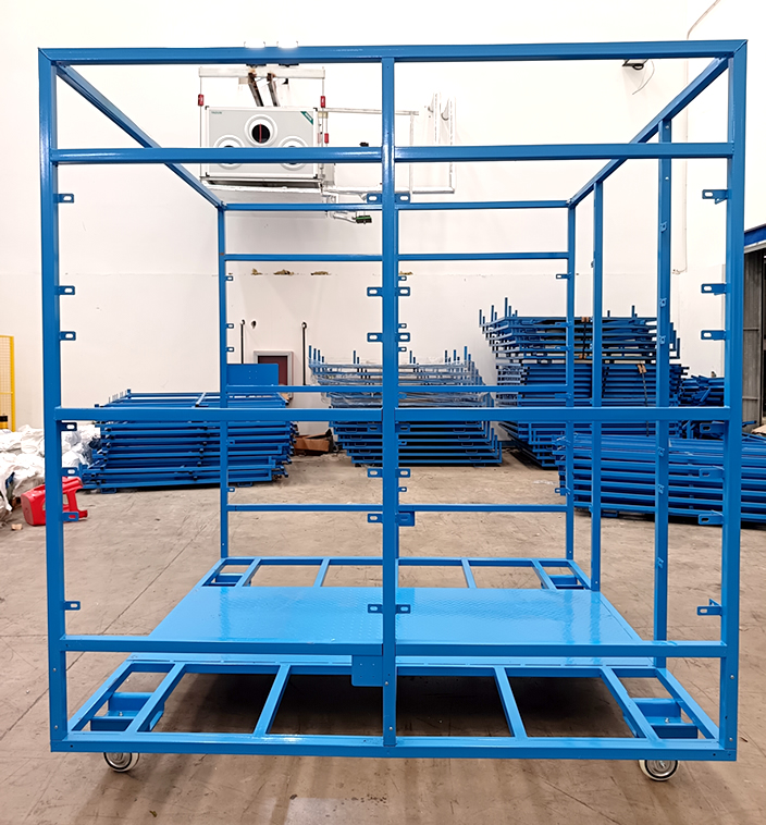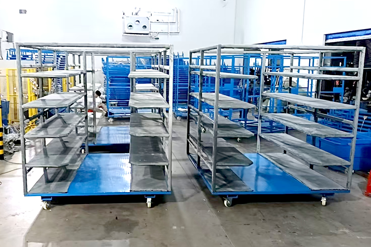立庫工裝車既保留了人工推行功能,又能與自動化立庫配套。可通過輸送機輸送到庫前堆垛機處,再由堆垛機轉運到貨架內,實現貨物的自動化出入庫。部分立庫工裝車還可根據所載產品的形狀特點,通過增加 eva 棉、pp 板、防滑膠墊等對產品做好定位、保護、防塵等效果。